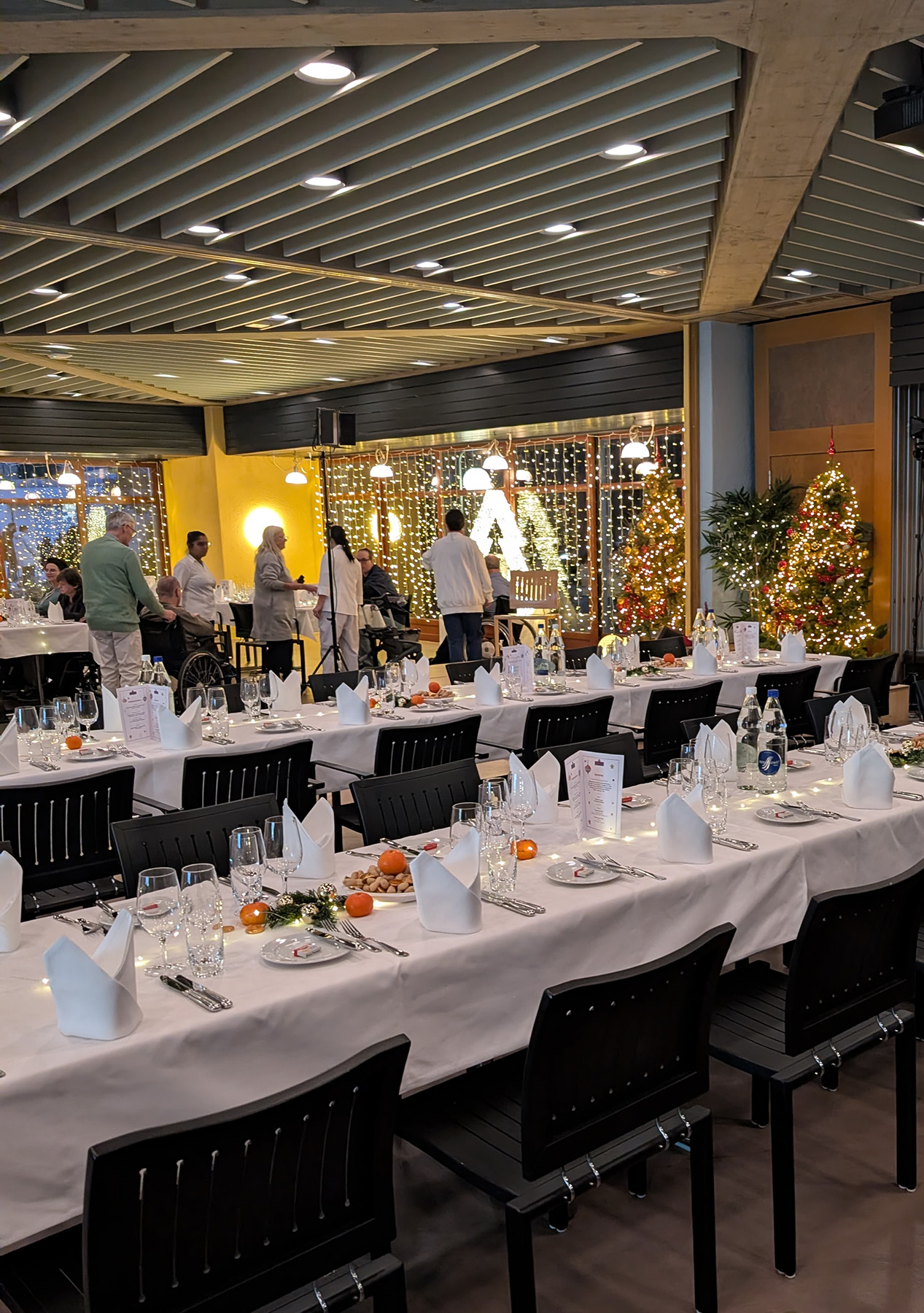 Am Freitag fand im iwaz die alljährliche Weihnachtsfeier statt. Bewohnerinnen und Bewohner sowie Mitarbeitende waren zum gemeinsamen Weihnachtsessen ins liebevoll dekorierte Restaurant iwaz Clubhaus eingeladen. Erstmals waren auch die freiwilligen Helfer*innen eingeladen, welche sich darüber sehr freuten und die Gelegenheit auch nutzten, um mit den Bewohnenden mehr Zeit zu verbringen.